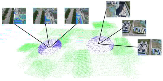 In this section, we use three aerial datasets to validate our method. Aerial dataset 1 is an area of Tiangong University, which contains 1510 images. Dataset 2 is the entire campus of Tianjin University of Technology and contains 8876 images. Dataset 3 is the Tianjin Xuefu Industrial Zone, which contains 25,726 images. Figure 2 shows the GNSS neighbor computing results of dataset 3. In this figure, two cameras are sampled and marked in red, and their respective GNSS neighbors are marked in blue. The camera represented by the red dot only performed image matching with the blue dot camera, avoiding redundant image matching with the green dot cameras. This can greatly reduce the time required for image matching.