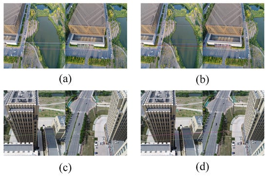 Comparison of image matching results. (a,c) The results using a traditional method such as SIFT. (b,d) The corresponding results generated by our cascade hashing image matching method.
