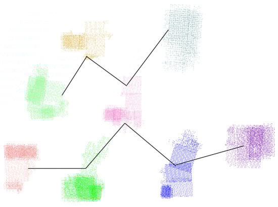 We further applied our method to a large-scale scene to verify the effectiveness of the method. Figure 5 shows the camera clustering and sparse point cloud reconstruction results of the Tianjin Xuefu Industrial Zone. The dataset contains 25,726 UAV aerial images. Cameras with different colors indicate different camera clustering results. As shown in Figure 5, our method can be applied to camera clustering in large-scale scenes and subsequent sparse point cloud generation work. Figure 6 shows the maximum spanning tree composed of camera subgraphs in the Tianjin Xuefu Industrial Zone. The cameras of different colors correspond to the camera classification results in Figure 5. The edge weights connected between nodes are defined as , , , and and have the same meaning as in Section 3.3. We performed camera image expansion work according to the maximum spanning tree.
