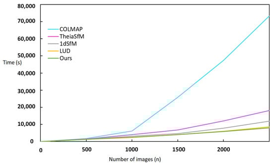 The traditional SFM is divided into two methods: incremental SFM and global SFM. Incremental SFM [,,,,,,] has been widely used in the first decade of SFM. It initializes image pairs and performs unified image extraction, matching, and epipolar constraint filtering. After obtaining the image relationship, it solves camera registration, triangulation, and bundle adjustment [,,] to obtain a sparse point cloud. Furthermore, this method continues to add images and repeats the abovementioned operations to complete the final reconstruction. An incremental SFM method that continuously adds new images causes drift errors or generates only a part of the scene. Moreover, because each image is added to the calculation, bundle adjustment must be repeated multiple times to ensure the accuracy of the camera pose and the 3D point cloud. Therefore, the entire process consumes a considerable amount of time. The memory requirements are increasing, which proves disadvantageous for limited computing resources.