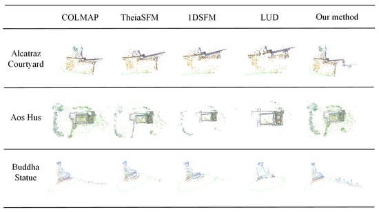 Performance evaluation: Similar to the performance evaluation in Section 5.1, we compare our method with other traditional methods on large-scale datasets. Table 4 presents a comparison of the reconstruction results with COLMAP [] and 1dSfm [] on large-scale datasets. The three aerial datasets in Table 4 correspond to rows 1–3 in Figure 11. Although our system uses global SFM, our method and COLMAP [] can complete almost the same number of camera registrations, and the reconstruction speed is nearly 20 times faster than that for COLMAP []. In addition, our system can obtain more 3D points than the other two methods.