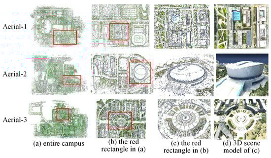 Effectiveness evaluation: We used the large-scale scenes in Section 4.2 to verify the effectiveness of our method. Due to the huge set of input images for large-scale scenes, we used all of the computing nodes in our cluster for experiments. Figure 11 shows the sparse point cloud reconstruction results for large-scale scenes. The first and second rows illustrate the scenes of datasets 1 and 2 in Section 4.2, respectively. The last row shows the campus of Tianjin Normal University. As seen in Figure 11, (a) represents the sparse point cloud reconstruction results of the entire campus, (b) represents the sparse point cloud of the red rectangle in (a), (c) is the sparse point cloud of the red rectangle in (b), and (d) is the corresponding 3D scene model of (c). As shown in Figure 11, our method can generate accurate sparse point cloud results and the corresponding 3D models for large-scale scenes.