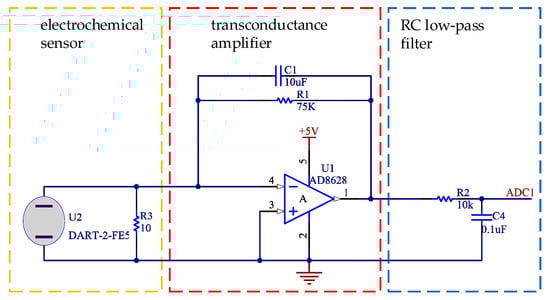 The electrochemical sensor uses the electrochemical oxidation process of the gas on the electrode. Accompanying the electrochemical reaction, the generated current is proportional to the gas concentration. As a result, the gas concentration can be determined by measuring the current. In Figure 1, R3 acts as the load of sensor current output. R1 is the resistance of the transconductance amplifier, whose resistance value determines the output voltage. The transconductance amplifier amplifies the weak current signal of the electrochemical sensor, so the noise and bandwidth of the amplifier are required to be high. In order to improve the accuracy of the circuit, an operational amplifier AD8628 with ultra-low offset, drift, and bias current characteristics was adopted. After the amplifier converts the current signal into the voltage signal, a low-pass filter composed of R2 and C4 is input to the analog-to-digital converter for measurement. The cut-off frequency (fc) of the RC low-pass filter is calculated as shown in Equation (1).