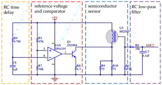 The gas-sensitive part of semiconductor gas sensor is a microsphere with heating wire and a metal electrode embedded. The sensor is installed in the metal shell of the stainless-steel mesh. Semiconductor gas sensors usually need several minutes of preheating to enter a stable working state after electrification. We can also apply 3–10 s of 2.2 ± 0.2 V high voltage to the sensor before normal detection so the sensor can stabilize and enter the working state as soon as possible. The working circuit of MQ303 is designed in the system as shown in Figure 2.