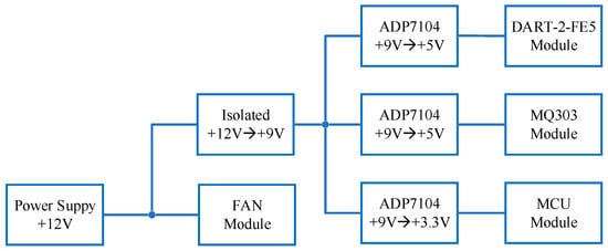 As an inductive component, the DC motor has a great influence on the system power supply when it works. In order to avoid the influence of the air sensor when the air duct works, besides the isolation of the control signal, the air duct power supply and the sensor power supply are separated from each other. The power supply of the sensor is supplied by isolated power, while the LDO chip ADP7104 with a low voltage drop and ultra-low noise is used to supply power for the working part of the sensor. The power tree structure of the system is shown in Figure 4.