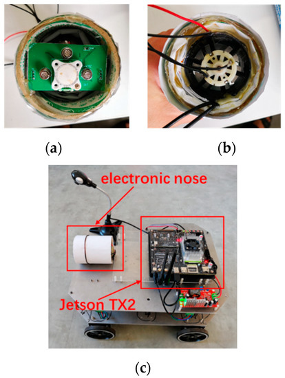 Front view of the active electronic nose (a), rear view (b), and installation on the robot (c).