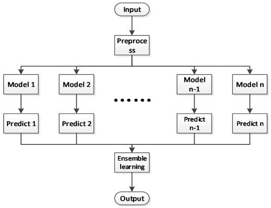 The ensemble classification model mainly uses the voting method, which is divided into two kinds. One is peer-to-peer voting without weights, that is, each basic model has equal status, and the final result is won by a large number of votes. The other is weighted voting, which assigns different weights to different algorithms. In our paper, we used peer-to-peer voting with the weights method to analyze the relationship among different basic models. The classes are equivalent to the candidates, while the classifiers are equivalent to voters. Each classifier outputs a class equivalent to a vote for the corresponding class, so the class with the most final votes is the final class. In a similar weighted averaging way, the voting scores of each algorithm are equal to their own weights. Finally, the result with large voting scores wins. The flow chart of the ensemble learning method is shown in Figure 6.