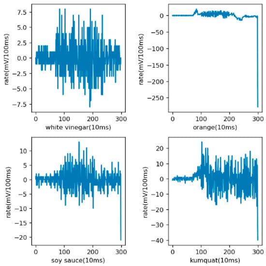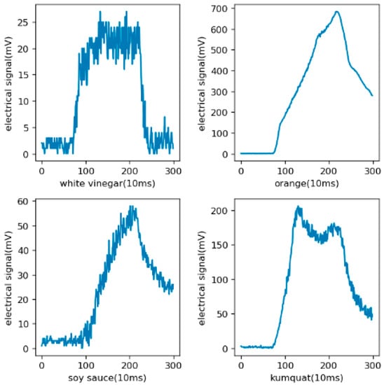 In order to improve the data reliability and model practicability of machine olfaction, a novel electronic nose with active perception was manufactured. In the environment of 26 ± 2 °C and 50% ± 5% RH relative humidity, each object was put beside the electronic nose for 3 s and actively adsorbed it via the built-in turbine of the electronic nose. After circuit and program processing, the 300 consecutive sampling points were obtained as a data record. The values of each point are the corresponding voltage signals in units of mV, which reflect the odor data of the object. There were ten classes in the data set, ‘white vinegar’, ‘orange’, ‘water alcohol’, ‘Erguotou’, ‘soy sauce’, ‘kumquat’, ‘tangerine’, ‘cola’, ‘apple’, and ‘Sprite’. Considering that the vibration, electromagnetic interference, and other factors might have influence on the data, the data should be preprocessed first.