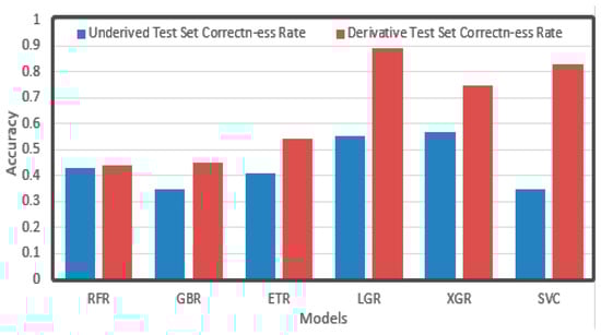 The prediction results are shown in Figure 10. It can be seen that after derivation, the accuracy significantly improved compared with the result before derivation, among which LGR, XGR, and SVC reached relatively good levels. Before and after derivation, the accuracy of RFR did not change significantly, but LGR increased from 0.5 to 0.9, and SVR increased from 0.3 to 0.8, nearly tripling. It may be that derivation reduces the dimensionality of data, which has a greater impact on the dimensionality-related algorithms such as SVR.