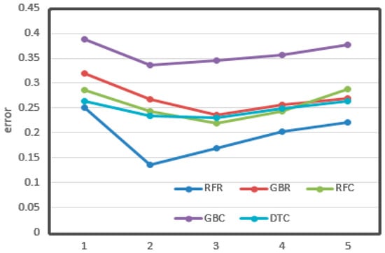 From the figures, it can be seen that some important parameters had considerable influence on the error of the results. In the process of adjusting the max depth, in Figure 11, the error of LGR reduced from 0.12 to 0.08, which decreased by 30%. It also decreased by about 20% overall. The division of the min sample leaf had a great impact on the results. In Figure 12, the RFR with the greatest change decreased from 0.25 to less than 0.15, nearly half of the original. From Figure 13, it can be seen that the learning rate was very important for training. The biggest change of LGR was from 0.35 to below 0.15, which reduced by more than half. These results may be related to the distribution characteristics and data processing methods of odor data. All of the optimal values have been written in the tables above.