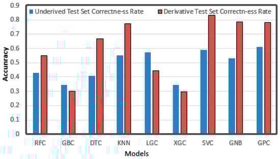 The forecast results are shown in Figure 14. Most of the algorithms had better results after derivation than before, among which KNN, DTC, SVC, GNB, and GPC achieved good results. We can see that the correct rate of most algorithms improved, among which the DTC with the highest improvement rose from 0.4 to 0.66, and most other algorithms also improved by about 0.2, which shows that the derivation operation was really very helpful. After derivation, the highest correct rate of a single algorithm reached 0.83. However, there are also a few algorithms that had lower accuracies after derivation, and the three reduced algorithms GBC, LGC, and XGC are all boosting-based algorithms. It may be that in the boosting algorithm, Taylor expansion is used to calculate the loss function, and a higher derivative is needed. The Taylor expansion after derivation is one less exponential minimum term than that before derivation. When calculating the error, the exponential minimum term is the maximum error and results in a lower accuracy. Thus, we used the original data to train the boosting class algorithm and used derivation for others.