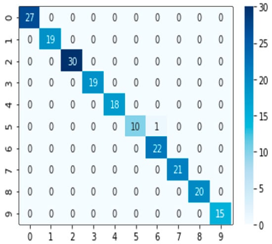In the regression method, three better performance algorithms were selected: SVM, XGB, and LGB. According to the integration method mentioned above, we assigned weights to three models, w_1, w_2, and w_3 respectively. Among them, w_1 + w_2 + w_3 = 1, and the optimal collocation 0.3, 0.45, and 0.25 was found from dozens of weight collocations through permutation and combination to obtain the SXL model. The average training time of each weight collocation was about 10 s. The accuracy of regression under this combination was 0.995049504950495. The confusion matrix is shown in Figure 15. From the figure, it can be seen that in nearly 300 test sets, there was only one result error. The target was classified, which belonged to the fifth category of ‘soy sauce’ into the sixth category of ‘kumquat’. After consulting the data, we found that the pH value of ‘soy sauce’ was 4, and the pH value of ‘kumquat’ was 3. The acidity of ‘soy sauce’ was comparatively similar, possibly due to the reason of H ion concentration. As a result, the data collected by the electrochemical sensor were comparatively similar, leading to classification errors.