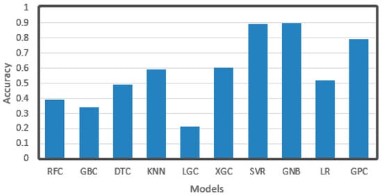 In order to solve the problem of slow calculation mentioned in the previous part, we selected a small part of the training set for training (30%) to test the performance of each algorithm. As we have come to the conclusion that derivation will lead to better results, the original data without derivation were no longer trained. These data were pre-processed, and then each classifier was trained and used to predict the data of the test set. The results are shown in Figure 16. As can be seen from the figure, the accuracy of RFC, DTC, and other algorithms based on decision tree were all below 0.5, and the clustering KNN was only up to 0.6, while GNB and GPC based on the gauss process were both above 0.8, and GNB even achieved the highest level of 0.9. At the same time, SVR ranked second place around 0.9. This may be because algorithms such as decision tree clustering need multiple trainings of a large amount of data to obtain a better model, while the gauss process is based on the statistical model, which has a higher utilization rate of data and can better match the original distribution of data, and has a better effect for small data. SVR is sensitive to the distribution of data, which may be related to the distribution of original data and the way of data preprocessing.