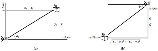 Geometrical illustration of the obtained angle measurements: (a) azimuth; and (b) elevation.