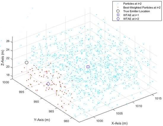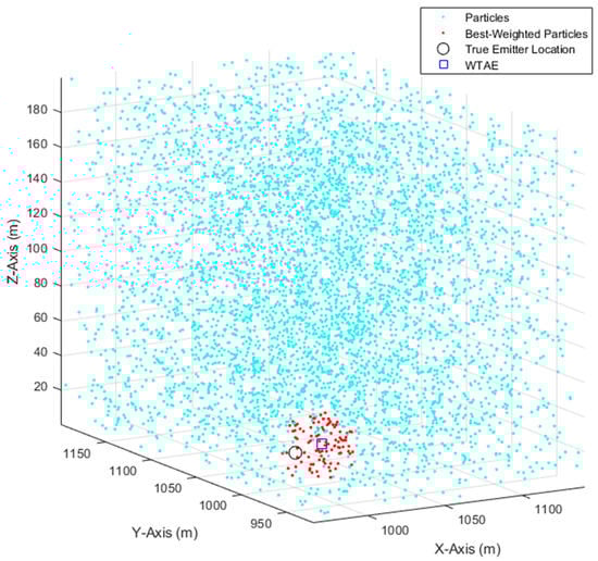 The implementation of Equations (26)–(28), with 5000 particles, when a UAS moved along a linear path collecting 101 measurements, with is illustrated in Figure 2, along with the best-weighted particles and WTAE of the emitter location in Equation (32).