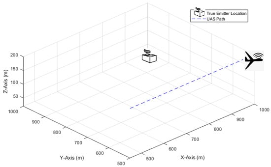 Most previous studies assume a LoB measurement accuracy of 1° to 2° [43] (p. 45). The performance of systems with higher inaccuracies is less well investigated. Typical DF accuracies of amplitude comparison and phase interferometer techniques are 3° to 10° and 0.1° to 3°, respectively [11]. In [27], a single system that can provide azimuth and elevation measurements with 2.5° accuracy was reported. Figure 4 illustrates the true emitter location and linear path of the UAS considered in the simulations. The emitter was located at (1000, 1000, 20) m and the UAS flew from (450, 500, 200) m to (950, 500, 200) m. Three different measurement points of 101, 51, and 11 were considered. In each case, the SDs of the azimuth and elevation measurement errors were assumed equal, i.e., , and were varied from 1° to 5° in 1° steps. Low-pass filtering was applied to the measurements to reduce noise and remove outliers. Root mean square error (RMSE) results were obtained over 100 simulation runs for the considered measurement noise levels to evaluate the batch-processing solutions TSCF, SSCF, and PF, with 5000 particles (Section 5.2). Representative performances, in terms of the root square error (RSE), of the IPF (with 1000 particles) at the investigated measurement noise levels are illustrated in Section 5.3.