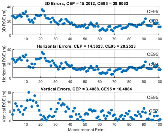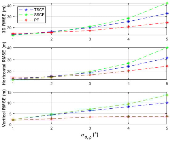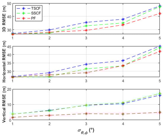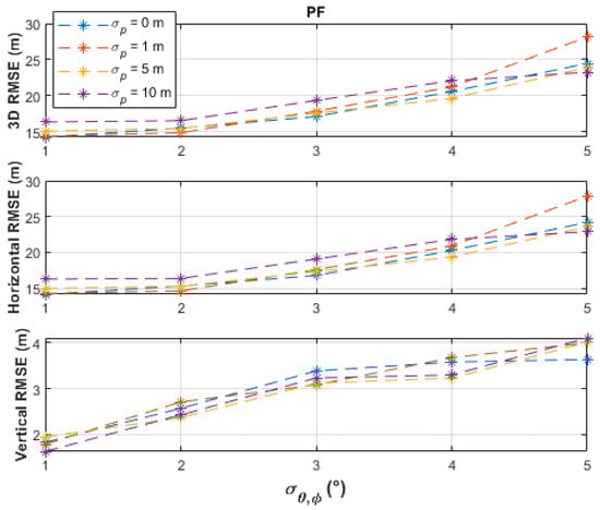 The weight of each particle is inversely proportional to the similarity metric used, which is the sum of squared distances between the measured and predicted azimuth and elevation angles. The implementation of Equation (31) has to account for the rare case of getting zero values for the two summation terms to avoid division by zero. The estimate of the emitter location, , is obtained by the weighted trimmed average estimate (WTAE) [41,42], in which a number , , of the best-weighted particles, is selected and their weights are normalized as: