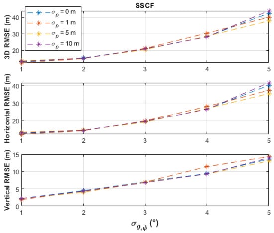 For the following, let be the unknown 3D position of the emitter, and be the known 3D position of the ES sensor or receiver at the measurement (i.e., observation) point in a 3D Cartesian coordinate system, while and are, respectively, the error-free azimuth and elevation measurements. The azimuth and elevation measurements are obtained by the horizontal and vertical antenna arrays, respectively, of the ES sensor system aboard the aerial platform (see Figure 1). Assuming zero-mean Gaussian noise, the azimuth and elevation noisy measurements can be modeled, respectively, as [9] (pp. 200, 202):