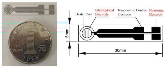 TC-5010 sensor substrates (Wuhan Huachuang Ruike Co., Ltd., Wuhan, China) were used in the experiment (Figure 1). The substrates with the size of 30 mm × 6 mm × 0.625 mm is made of Al2O3 ceramic sheets while the Pt electrode are printed on the substrate. The Pt electrode consists of a heater coil, temperature control electrode, interdigitate electrode, and measuring electrode. The sensitive material is screen printed on the interdigitate electrode. The sensing film is a circle with a diameter of 3.2 mm. The working temperature of the sensing film is automatically controlled by the input power to the heating coil because Pt has a good linear resistance to temperature relationship.