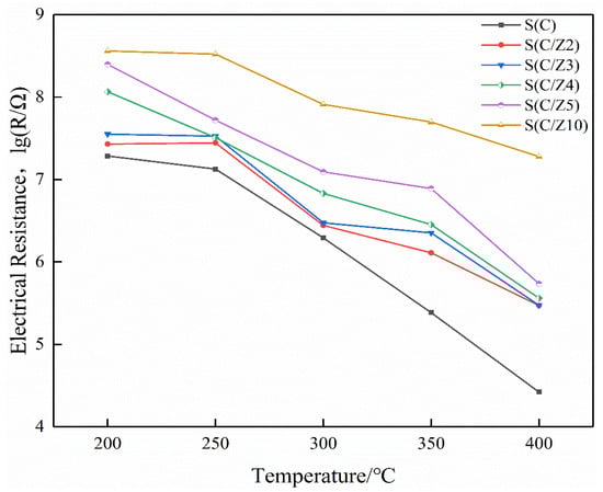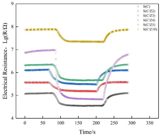 Figure 10 is the electrical resistances of the sensors working at different temperatures in air. It can be seen that the resistances of all the sensors decreased with the increase of the operating temperature in air. As a semiconductor, the current-carrying electrons in SnO2 increased when it was heated, resulting in a decrease in its resistance. It is also shown that the resistances of the modified S(C/Z2), S(C/Z3), S(C/Z4), S(C/Z5), and S(C/Z10) sensors with the modified layer were higher than that of the S(C) sensor without the modified layer in air. The electrical resistances of sensors had a strong correlation to the amount of oxygen absorbed. The more oxygen absorbed, the higher the electrical resistances are. The main components of ZSM-5 were oxides with a movable skeleton structure composed of Si and Al, and the oxygen in the skeleton can diffuse to the surface of the nano-SnO2 film. With the increase of the thickness of the modified ZSM-5 layers, more and more oxygen in the skeleton migrate to the surface of the nano-SnO2 and became the adsorbed oxygen. The adsorbed oxygen takes electrons away from the nano-SnO2 film, leading to the increase in the electrical resistances of the sensors in air.