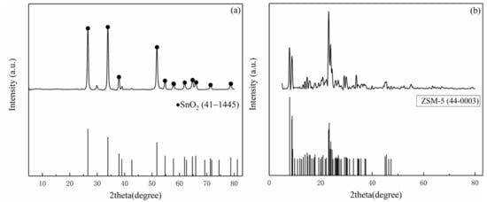 Figure 3 shows the XRD patterns of the nano-SnO2 and the commercial ZSM-5. The prepared nano-SnO2 powders had peaks in accordance with PDF card No. 41-1445. It is proved that the nano-SnO2 powders were successfully prepared by thermal decomposition of stannous oxalate and had a typical tetragonal rutile structure (Figure 3a). The XRD pattern of the commercial ZSM-5 zeolite shows two sharp peaks near 2θ = 7° and 8°, and three strong peaks near 2θ = 23–25°.The position of peaks was consistent with that of PDF card “PDF 43-0003” (Figure 3b).