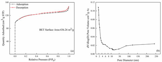 The nitrogen adsorption/desorption isotherm and pore size distribution of the commercial ZSM-5 zeolite are shown in Figure 6. It is clear that the ZSM-5 zeolite shows a large specific surface area of 436.26 m2/g and the average pore size was 2.039 nm. The pores in the ZSM-5 zeolite were mainly distributed between 1.9 and 2 nm according to the pore size distribution curve (Figure 6b), which was in good agreement with the TEM result.