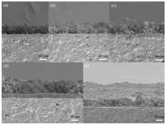 SEM micrographs of the cross-sections of the sensors: (a) S (C/Z2), (b) S (C/Z3), (c) S (C/Z4), (d) S (C/Z5), and (e) S (C/Z10).