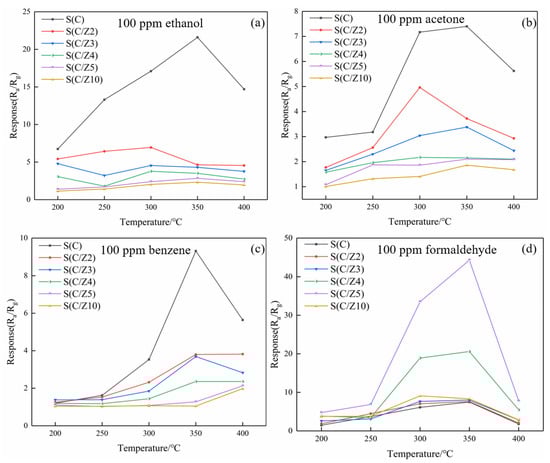 Figure 11 shows the response values of the sensors to different testing gases at different temperatures. As can be seen from Figure 11a, the responses of the sensors with the modified layer to ethanol decreased significantly, and the optimal operating temperature of the sensors to ethanol was 350 °C. The variation of the responses of the sensors with the modified layer to acetone and benzene were basically similar to ethanol, and the responses of the sensors to acetone and benzene decreased gradually with the increase of the thickness of the ZSM-5 modified layer (Figure 11b,c). The responses of the sensors with the modified layer to formaldehyde were quite different. The ZSM-5 modified layer greatly improved the responses of the sensors to formaldehyde. When the sensors with the modified layer worked at 350 °C, the response of the S(C) sensor was 7.48–100 ppm formaldehyde. Simultaneously, the responses of the S(C/Z4) and S(C/Z5) sensors were 20.6 and 44.3, respectively, to 100 ppm formaldehyde at the same temperature.