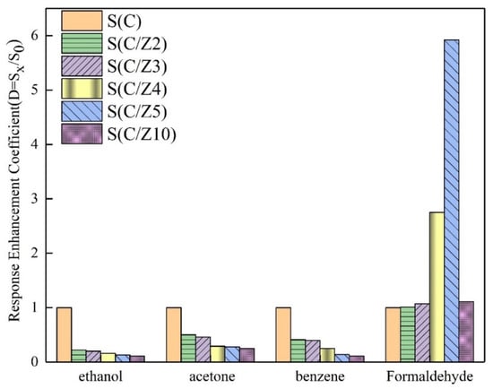 In order to further compare the selectivity of the sensors with and without the modified layer, the response enhancement coefficients of the sensors to the four tested gases at 350 °C were drawn in Figure 12. All the response enhancement coefficients of the sensors with the modified layer to ethanol, acetone, and benzene were less than 1. With the increase of ZSM-5 modified layer, the response enhancement coefficients of the sensors with the modified layer to ethanol, acetone, and benzene decreased significantly and gradually. The variation of the response enhancement coefficients of the sensors with the modified layer to formaldehyde was a little perplexing. When the ZSM-5 layer was screen printed twice and 3 times, the response enhancement coefficients of the S(C/Z2) sensor and the S(C/Z3) sensor were approximately close to 1, which means the responses of the S(C/Z2) sensor and the S(C/Z3) sensor to 100 ppm formaldehyde had no difference with that of the S(C) sensor. Curiously, the response enhancement coefficients of the S(C/Z4) sensor and the S(C/Z5) sensor increased dramatically and reached 2.75 and 5.92 respectively. In other words, the response of the S(C/Z5) sensor with the ZSM-5 modified layer thickness of 19.5 μm to 100 ppm formaldehyde was 5.92 times that of the unmodified S(C) sensor at 350 °C. When the ZSM-5 modified layer thickness reached 31.8 μm, the response enhancement coefficient of the S(C/Z10) sensor closed to 1 again. The reason for the change in the response enhancement coefficients will be discussed below.