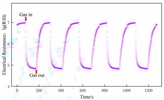 The sensors must have a good stability to meet the demand of practical applications []. In order to verify the stability and reliability of the test data, taking the S(C/Z5) gas sensor as an example, a cyclic test was performed on 100 ppm formaldehyde at 350 °C, and the transient response curve is depicted in Figure 13. It can be observed that the baseline resistance of the sensor decreased slightly between the second cycle and the first cycle. However, from the third cycle, the baseline resistance of the sensor was maintained at a stable value. Similar behaviors can be found in the work of other researchers [,]. This is attributed to the testing gas molecules remaining bonded to the sensitive materials and desorping incompletely although a recovery step is applied to the sensor []. Instead, under the same test conditions, the electrical resistance of the sensor to 100 ppm formaldehyde is quite stable in each measuring cycle. The result indicated that time could not influence the response regularity of the gas sensor, and the S(C/Z5) sensor had good stability.