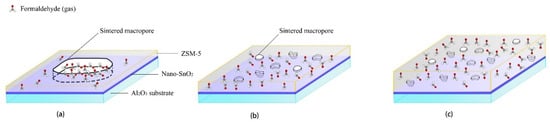 Although the thickness of the ZSM-5 layer was only increased by 1 μm and 3 μm compared with the S(C/Z3) sensor when the modified layer was screen printed 4 and 5 times, the density of the layers was significantly improved, and the size of the sintered macropores was also reduced to 2–3 μm. The sintering macropores could no longer penetrate the whole modified layer (Figure 14b). It is difficult for formaldehyde gas molecules to directly reach the nano-SnO2 sensitive layer through the sintered macropores. Then the micropores in ZSM-5 zeolite play a dominant role in molecular sieving, gases enrichment, and catalysis of the reactions [,,,,,]. It can be seen that the effect of the ZSM-5 modified layer was closely related to the integrity of the film. For screen printing technology, due to volatilization of printing oil, a single printing process can only obtain a non-continuous film [,], but multiple printing can offset the effect of sintering macropores through pore filling and paste extruding. The integral screen printed ZSM-5 layer without through holes could work as a continuous ZSM-5 film.