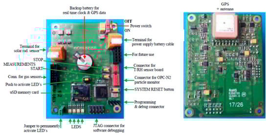 The URBMOBI 3.0 PCB is equipped with a GNSS receiver and an SD card to store data offline with a time resolution of 2 s. Figure 2 shows the setup of the URBMOBI sensor ensemble in its metal box. The instrument is not completely protected against rain and spray water and in such cases, the measurements should be stopped.