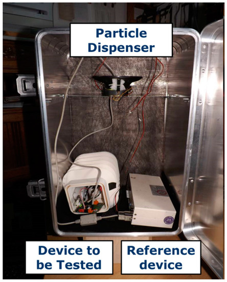 As a first step, the LCS is calibrated against a reference device, Grimm 1.108, in a stationary setup. The setup and procedure were followed according to Laquai et al. (2020) [65]. Figure 3 shows the test setup using a particle generator. The particle generator is a simple Zarges™ box acting as a particle chamber. The top portion of the box is provided with a loudspeaker and a smoke generator. Flour is used as a source of particles greater than 2.5 µm and is dispensed with the help of the loudspeaker. The smoke generator is used to dispense particles with less than 2.5 µm aerodynamic diameter. Both particle dispensers are connected and operated via external circuitry. The bottom part of the box is fitted with a Grimm 1108 device as the reference and space to place the LCS to be tested. The entire experiment is carried out under constant temperature (≈20 °C) and RH (≈50%) conditions. The results of the experiment are presented in Figure 4.