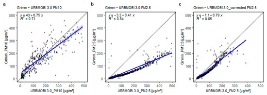 Results of the calibration tests recorded by the URBMOBI 3.0 (metal housing) and the reference instrument (Grimm 1.108) inside the particle generator with a time integral of 6 s; (a) PM10 scatter plot between Grimm 1.108 raw data and URBMOBI 3.0; (b) PM2.5 scatter plot between Grimm 1.108 and URBMOBI 3.0 raw data; (c) PM2.5 scatter plot between Grimm 1.108 raw data and URBMOBI 3.0 data corrected using the compensation function.