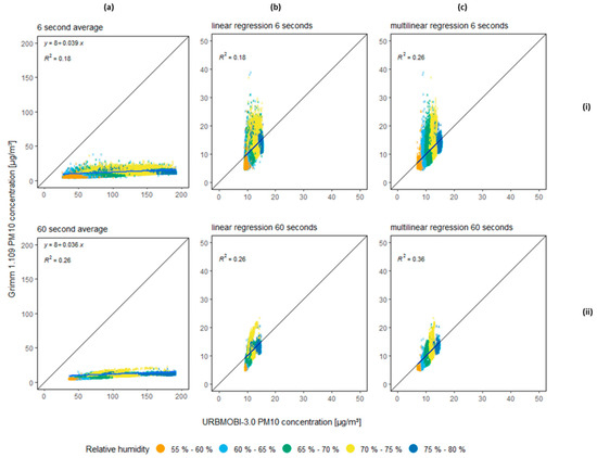 URBMOBI 3.0 (LCS) vs. Grimm 1.109 (reference device) PM10 comparison at Berlin-Adlershof; (a) scatter plot between the Grimm 1.109 raw data and URBMOBI 3.0 raw data with a time integral of 6 (i) and 60 (ii) seconds; (b) scatter plot between the Grimm 1. 109 raw data and URBMOBI 3.0 data corrected with linear regression with a time integral of 6 and 60 s (c) scatter plot between the Grimm 1.109 raw data and URBMOBI 3.0 data corrected with multi-linear regression, using temperature and RH as explaining variables, with a time integral of 6 and 60 s.