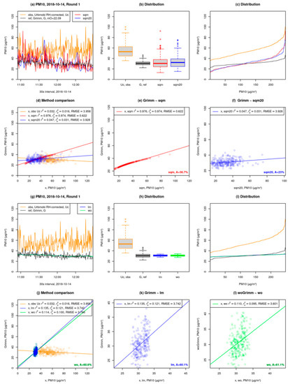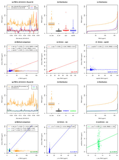 - Time series in preprocessed 30s interval: Observations (obs, URBMOBI 3.0) are shown in dark orange. Reference (ref, Grimm) is shown in black. “lm” refers to the corrected URBMOBI 3.0 data based on multi-linear regression (lm(G~U + RH + T)) wherein the intercepts and coefficients are gathered using a 5-min mean of URBMOBI 3.0 and Grimm data. Intercepts and coefficients are applied to the original URBMOBI 3.0 in the 30 s interval are shown in blue. For URBMOBI 3.0 data that was already RH-corrected with the C-factor RH was not considered for the multi-linear regression. “wo” is the same as lm, but with the outliers removed before calculating the intercepts and coefficients over a 5-min mean of both URMOBI 3.0 and Grimm data. Outliers are based on 30 s interval data: >1.5·Inter quartile range (IQR) as shown in light green (Figure 7g).