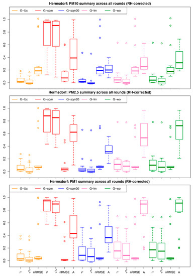 Although the linear regression model (lm) seems to look better (Figure 7a,g), it is also apparent in comparing the two figures that the spatial and temporal variability is lost in linear regression. Each measurement round is individually calibrated and a factsheet similar to Figure 7 is generated. Similar patterns are observed for most of the measurement rounds. Therefore, the quantile assignment is considered as the superior method. Figure 8 summarises all the rounds and generates a boxplot for each of the correction models considered for PM10, PM2.5 and PM1. It also shows the summary of the comparison between the different models and their respective coefficients of determination: