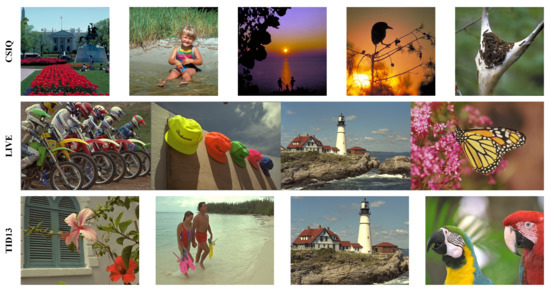 The pristine images are from a set of source images and reflect adequate diversity in terms of image content, including pictures of faces, people, animals, close-up shots, wide-angle shots, nature scenes, man-made objects, images with distinct foreground/background configurations, and images without any specific object of interest. Figure 1 demonstrates several representative images in these datasets. Interestingly, it was found that the refernce images in CSIQ are distinctive from those in the other two databases, while more than ten images have the same or similar content as that shared in LIVE and TID13; for instance, the lighthouse, as shown in Figure 1.