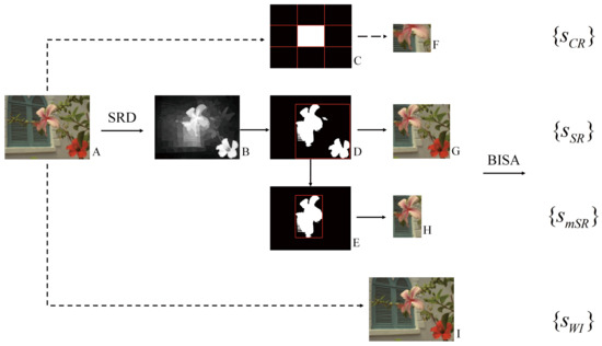 The proposed hybrid framework is shown in Figure 2. It uses SRD methods to generate saliency maps to guide BISA tasks (the arrows with solid line). An SRD method computes the saliency map (B) of an input image (A). Then, the saliency map is binarized into foreground masks, and a minimum outer rectangle is generated accordingly (D). Next, two kinds of salienct-region-guided BISA experiment are conducted. One takes the image region in the rectangle as the input (G), and the other uses the binary mask with the largest area (E) to generate its outer rectangle and to obtain the image region as the input (H). For fair comparison, two additional experiments are carried out. One uses the source image as the input (I), and the other takes the center area (C) of the image as the input (F), since the center region, as a center prior, assumes salient objects are more likely to be located at the center of an image [11]. Therefore, to each BISA model, four kinds of experiments are conducted by using different image inputs (F-I). Finally, by using different kinds of image input, including center region (CR), salient region (SR), major salient region (mSR) and whole image (WI), a BISA model predicts the scores as , , and , respectively.