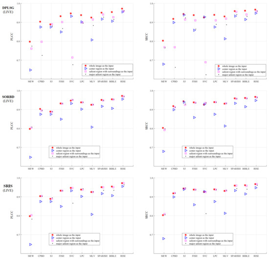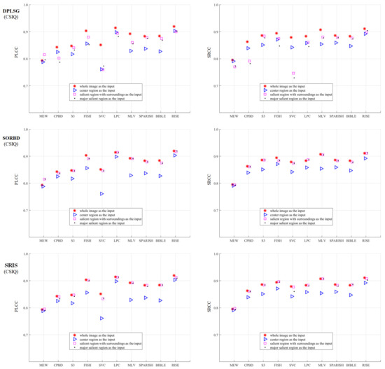 Based on the proposed framework, the effect of salient region inputs on the BISA performance is investigated. A total of three SRD methods combined with ten BISA models are explored, and three datasets (CSIQ, LIVE, and TID13) are involved in the quality assessment of Gaussian blurring images. The prediction performance is quantified with PLCC and SRCC values. To each dataset, the results are demonstrated from three parts: