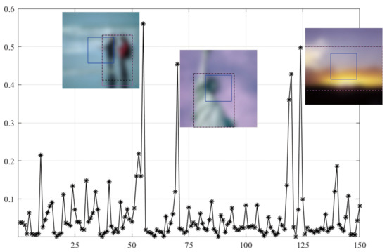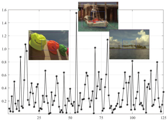 As shown in Figure 7, the MEW model obtains the lowest PLCC score when using the CR input. Based on the SORBD method combined with the MEW model, the absolute score difference in each image is shown in Figure 8 where the horizontal axis shows the image index and the vertical axis shows the score difference. In addition, the images causing the three largest score drops are illustrated. This indicates the three images have various levels of blurring distortion. Moreover, the CR input covers limited edge structures, while the detected salient regions retain most or all of the edge structures.