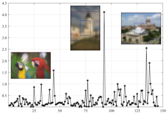 As shown in Figure 5, the MEW model obtains the lowest PLCC score when using the CR input. Based on the SORBD method combined with the MEW model, the absolute score difference in each image is shown in Figure 6, where the horizontal axis shows the image index, and the vertical axis shows the score difference. In addition, images leading to the three largest score drops are illustrated. The figure shows that the images are blurry, and the center regions cover relatively few edge structures in comparison to the whole images, both of which are important to the MEW model in image blur estimation. In contrast, when using salient regions as input, the score drop is relatively small, because the regions retain most edge structures and scene content.