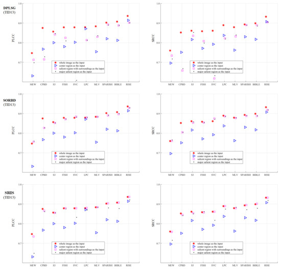 Based on the TID13 Gaussian blurring images, Table 3 shows the results of a comparison between salient region inputs and the CR input from PLCC and SRCC values. By setting the CR input as the baseline, the quantitative difference indicates that most BISA models achieve a better performance. Specifically, the MEW model has a 0.128 higher PLCC value and a 0.069 higher SRCC value, and the MLV model obtains an even better improvement. Regarding the SRD methods, SORBD and SRIS outperform the DPLSG method.
