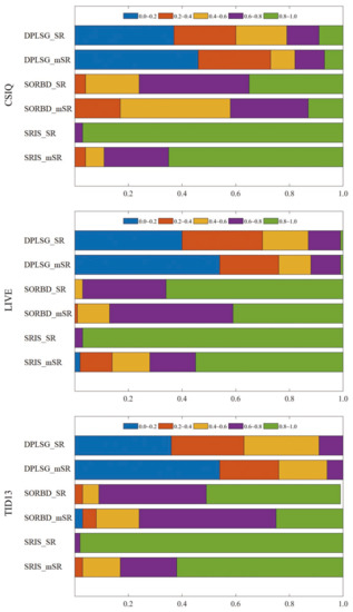 The distribution of the size proportion of used salient regions over all the images is shown in Figure 9. The size proportions are divived into five bins with equal intervals, which are highlighted by different colors. On the CSIQ dataset, the size proportion of mSR input generated from the DPLSG, the SORBD and the SRIS mainly falls into the range of (0.0, 0.2], (0.4, 0.6] and (0.8, 1.0], respectively. The similar phenomenon is also observed on the other two datasets.