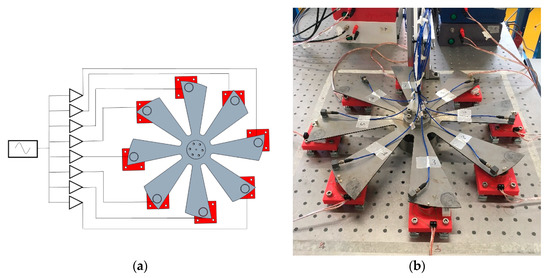 The experimental setup is comprised of a still plate simulating an ideal bladed disk, a series of electromagnets, a set of amplifiers, sensors to measure the disk response and assess the applied forces, and a multi-channel signal generator. Figure 1a shows the conceptual schema of the setup. The setup is inspired by the experimental work documented by Bonhage et al. [16], but in the present case, the excitation source is produced by electromagnets, likewise in the test rig described by Firrone and Berruti [17].