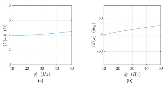 Impedance of the electric circuit: (a) amplitude; (b) phase angle.