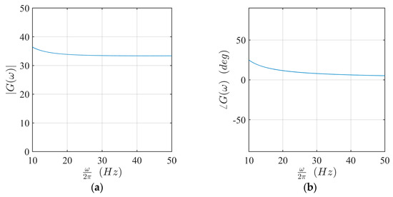 The eight magnets were driven by eight linear power amplifiers. They were class-B units, built following a push-pull configuration, with 200 W nominal power. Figure 4 shows the voltage gain G of the amplifiers. In the frequency range used for the experiments described herein, the modulus of the gain was about 35 and the phase angle was about 15°.