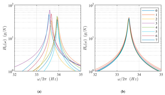 The system identification was carried out using the force estimated from the measured current as the input and the blade acceleration as the output. Figure 5a shows the modulus of the frequency response function (FRF) for the eight blades of the disk measured in the initial experimental setup. Blade-to-blade differences both in terms of natural frequency and amplitude are clearly visible.