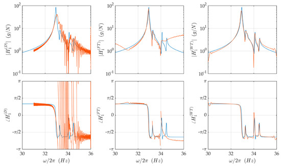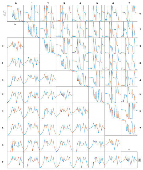Figure 6 shows the amplitude (lower triangle) and phase (upper triangle) of the components of H evaluated adopting the H1 estimator [19] (solid blue line). Regarding the direct terms, the behavior of the disk appeared symmetric, while some lack of symmetry was visible in the cross-terms. In particular, the coupling terms of neighboring blades were repeated every second blade.