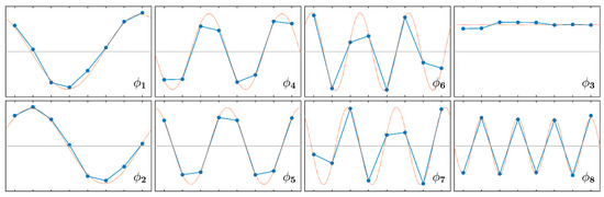 where λr and ψr are, respectively, the eigenvalues and the eigenvectors of A. Table 1 shows the natural frequencies and damping ratios of the eight identified vibration modes, together with the HI of the corresponding mode shape. Figure 7 shows the mode shapes estimated from data (solid line) and the best fitting harmonic function (dashed line).